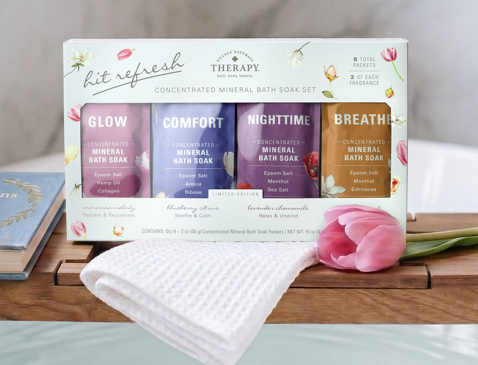 Meet our limited-edition Hit Refresh Bath Soak Gift Set—a soothing collection of eight Concentrated Mineral Soaks designed to help anyone unwind, recharge, and feel restored.