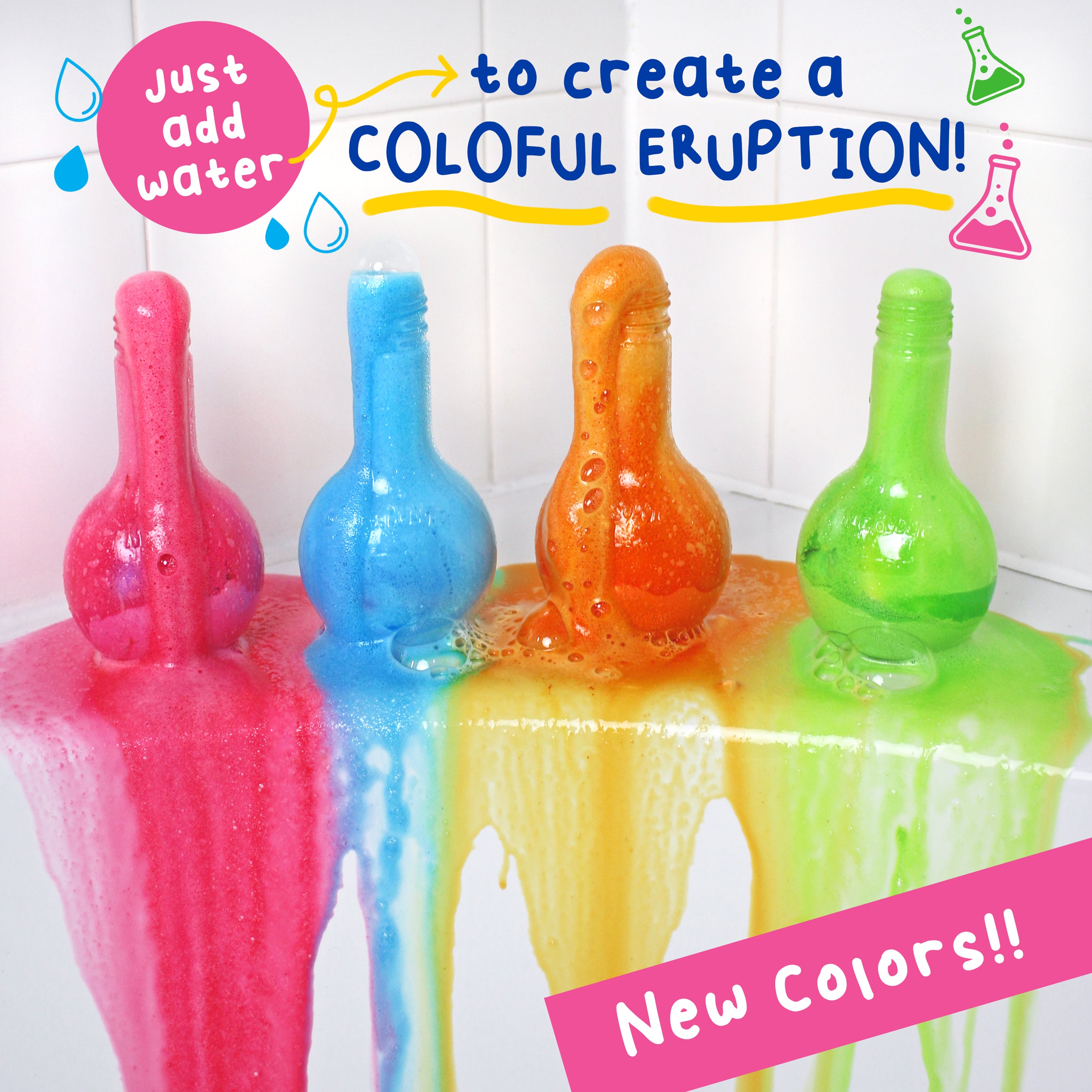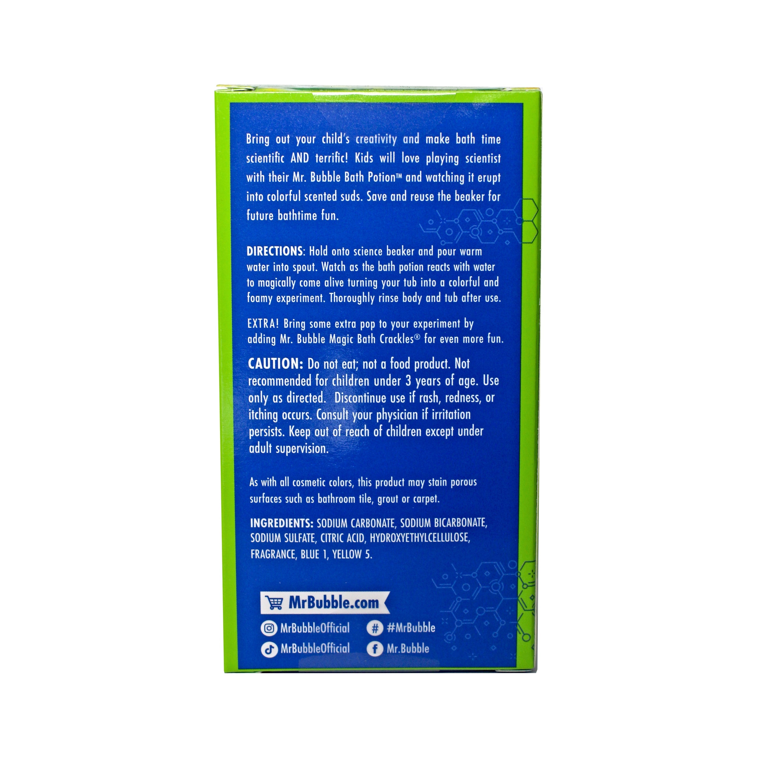Hold onto the science beaker and pour warm water into spout. Watch as the bath potion reacts with water to magically come alive turning your tub into a colorful and foamy experiment. Thoroughly rinse body and tub after use. For Extra Pop: Add Mr. Bubble Magic Bath Crackles for even more fun!