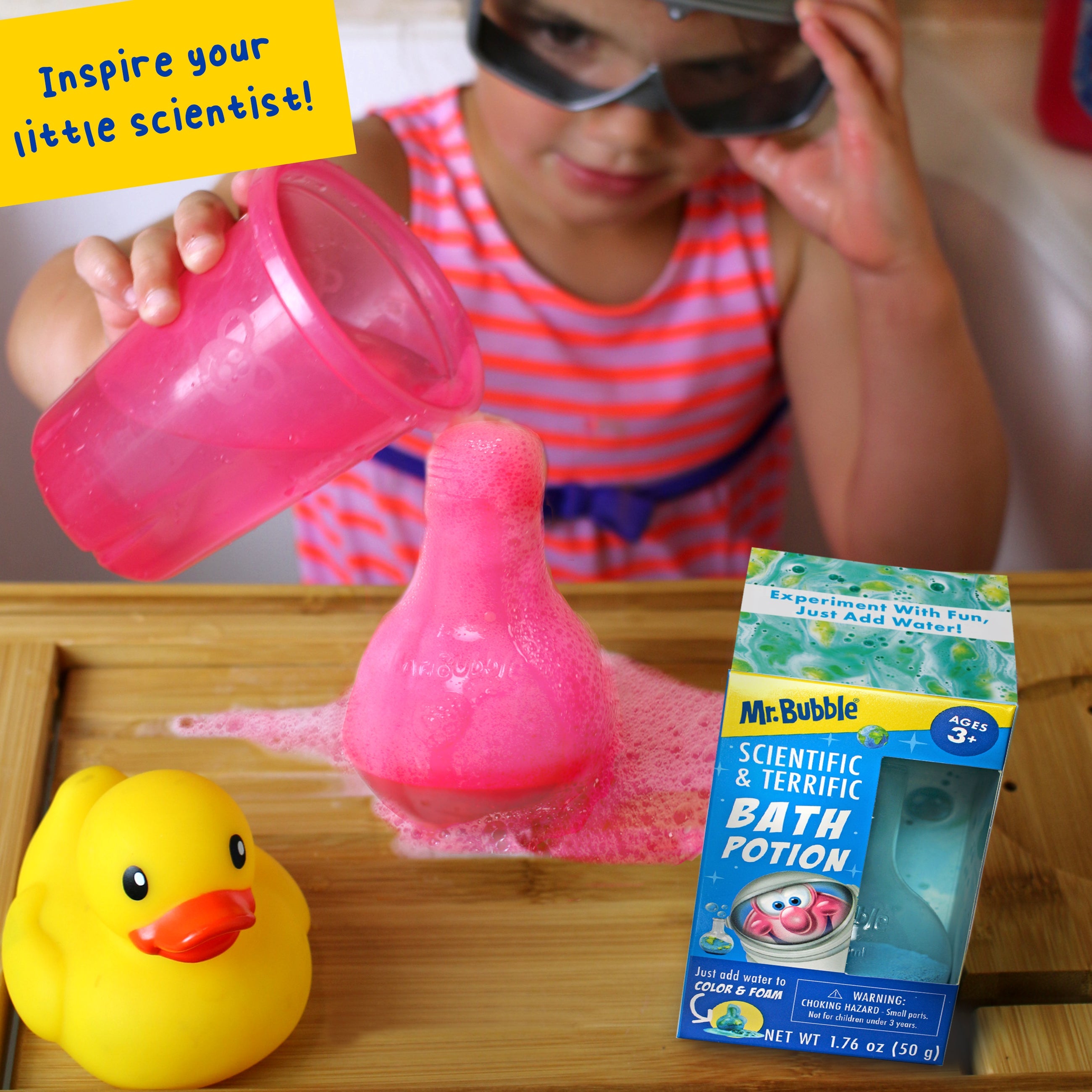 Your little mad scientist will love turning their tub into a bubblin’ fun lab with Mr. Bubble Scientific & Terrific Bath Potion. Simply place the beaker under running water and be in awe as colorful foam erupts into bubble gum scented suds. Now available in four bright new colors!
